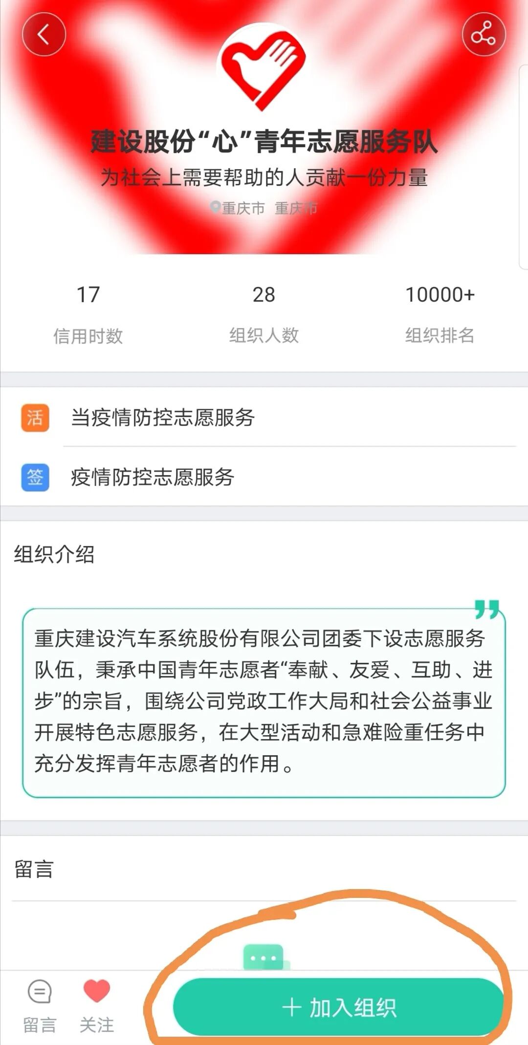 进入“建设股份“心”青年志愿服务队”界面,右下角点击“加入组织”即可